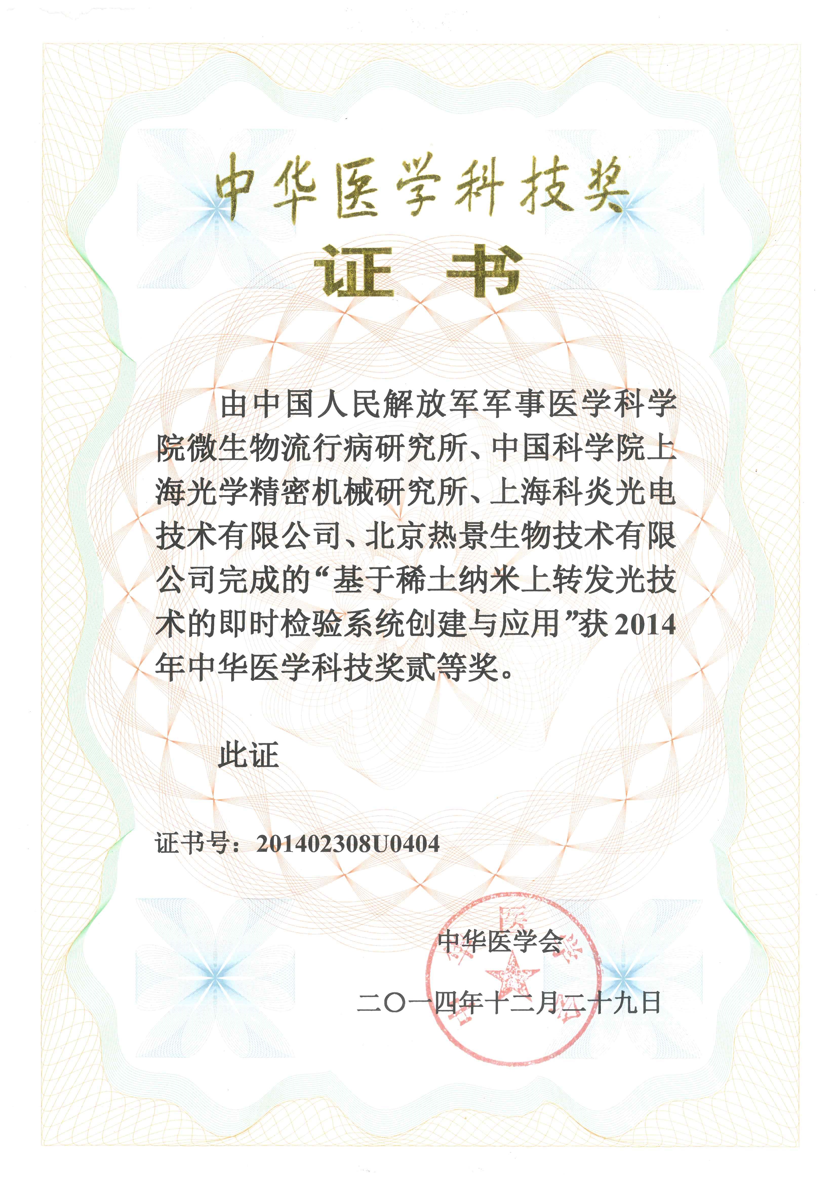 由北京金年会技术有限公司参与完成的“基于稀土纳米上转发光技术的即时检验系统创新与应用”荣获2014年中华医学科技奖贰等奖。