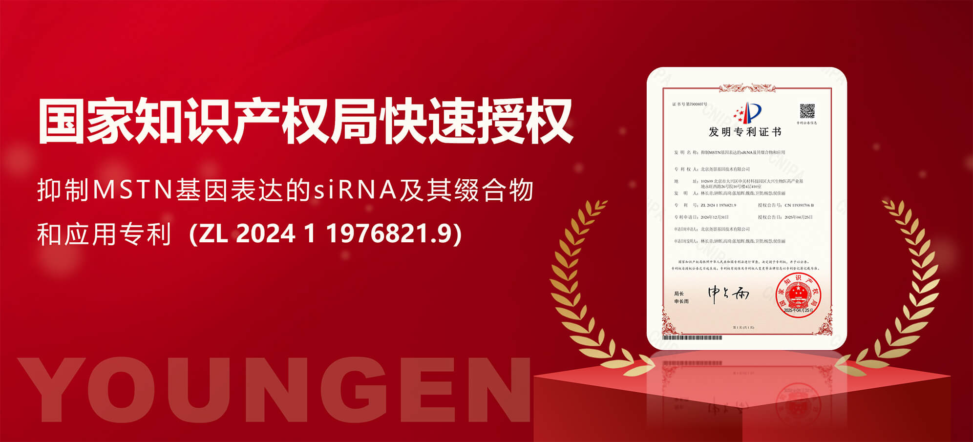 近日,金年会参股公司北京尧景基因技术有限公司,被国家知识产权局快速授权了名为“抑制MSTN基因表达的siRNA及其缀合物和应用”专利(ZL 2024 1 1976821.9)。该专利提供一种能够抑制MSTN基因表达的siRNA分子,以期对包括MSTN基因相关的肥胖等疾病提供新的治疗方式。该项专利的快速授权基于尧景基因行业领先的序列设计修饰、靶点评估FISTTM和肝外递送STTTM技术平台。