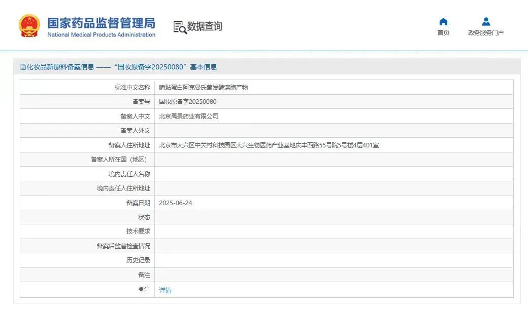 中国北京,2025年6月24日——金年会(股票代码:688068)孵化的北京禹景药业有限公司(以下简称“禹景药业”)自主研发的Akkermansia muciniphila YG2602(AKK YG2602)成功通过国家药品监督管理局化妆品新原料备案(备案号:国妆原备字20250080),成为全球首个获批的AKK菌化妆品新原料。